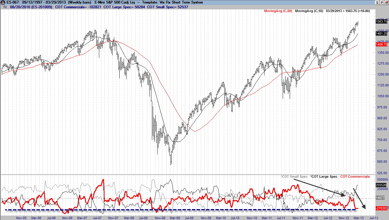 The net commercial short position has really gotten large here with the ES. You can see it has been clearly declining sharply during this whole rally since October of 2011 so knowing that has been of no value. I talk about this all the time that using this is an art not a science. We have now gotten to a pretty extreme level and it has increased sharply lately. The real trick with this market in particular is that we don't know how the unprecedented manipulation by the FED of this index specifically is being categorized in the report. I think it is showing up in the Large Speculator category because you can see there was a huge net long at the major low back in 2009 and Large Speculators do not trade that way, they scale in and scale out. As a result it is highly unlikely the normal Large Specs would have had major longs down there. All else being equal they would have had major shorts, just study some charts.